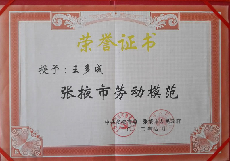2012年榮獲張掖市勞動模范證書